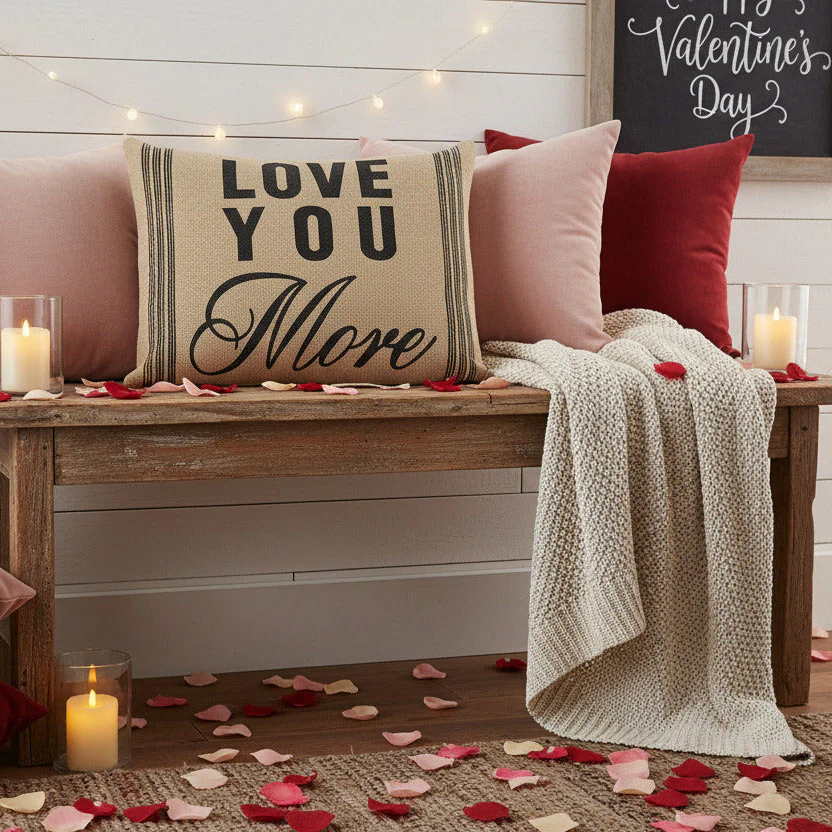 - Black stenciled "Love You More" accented with grainsack stripes on each side